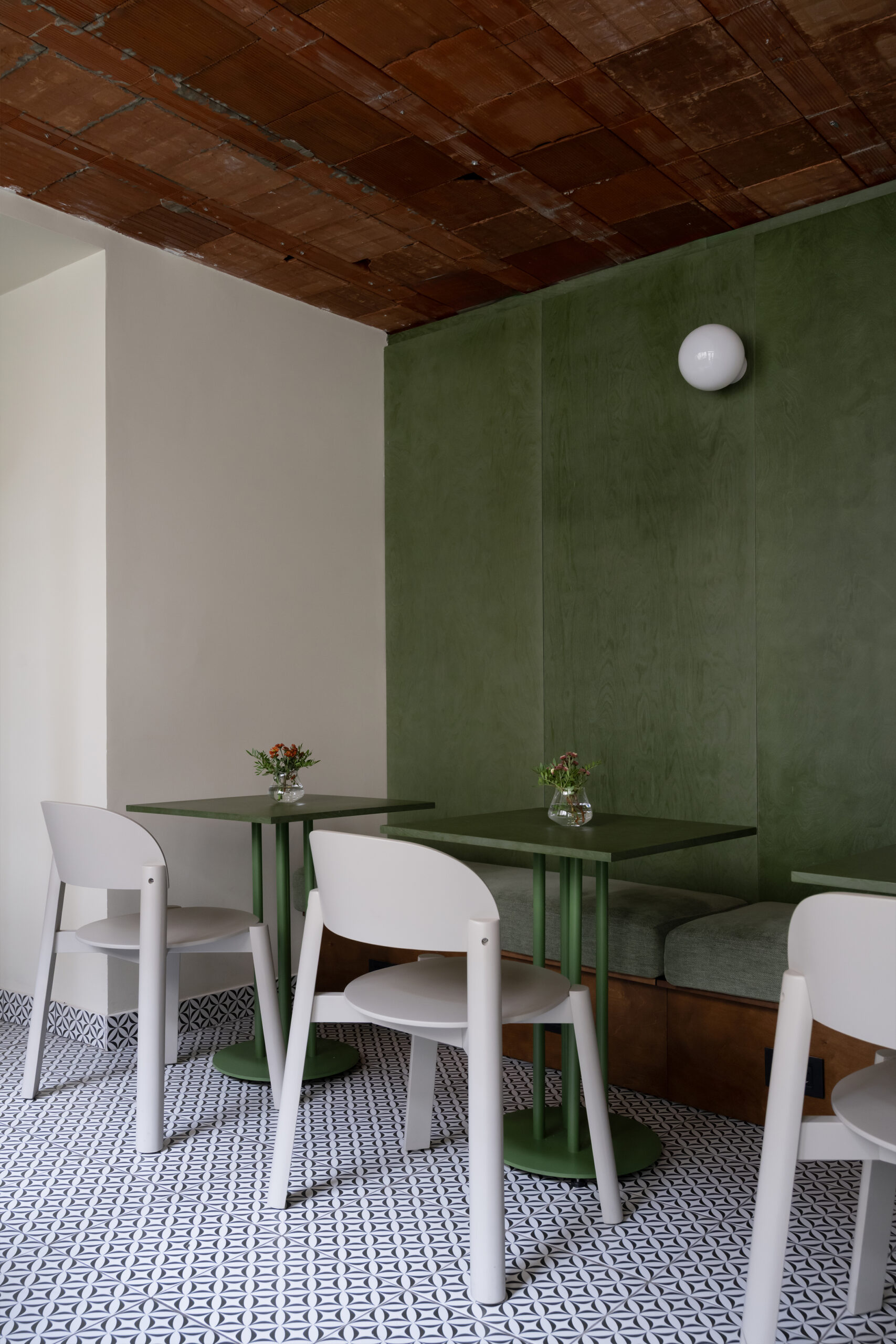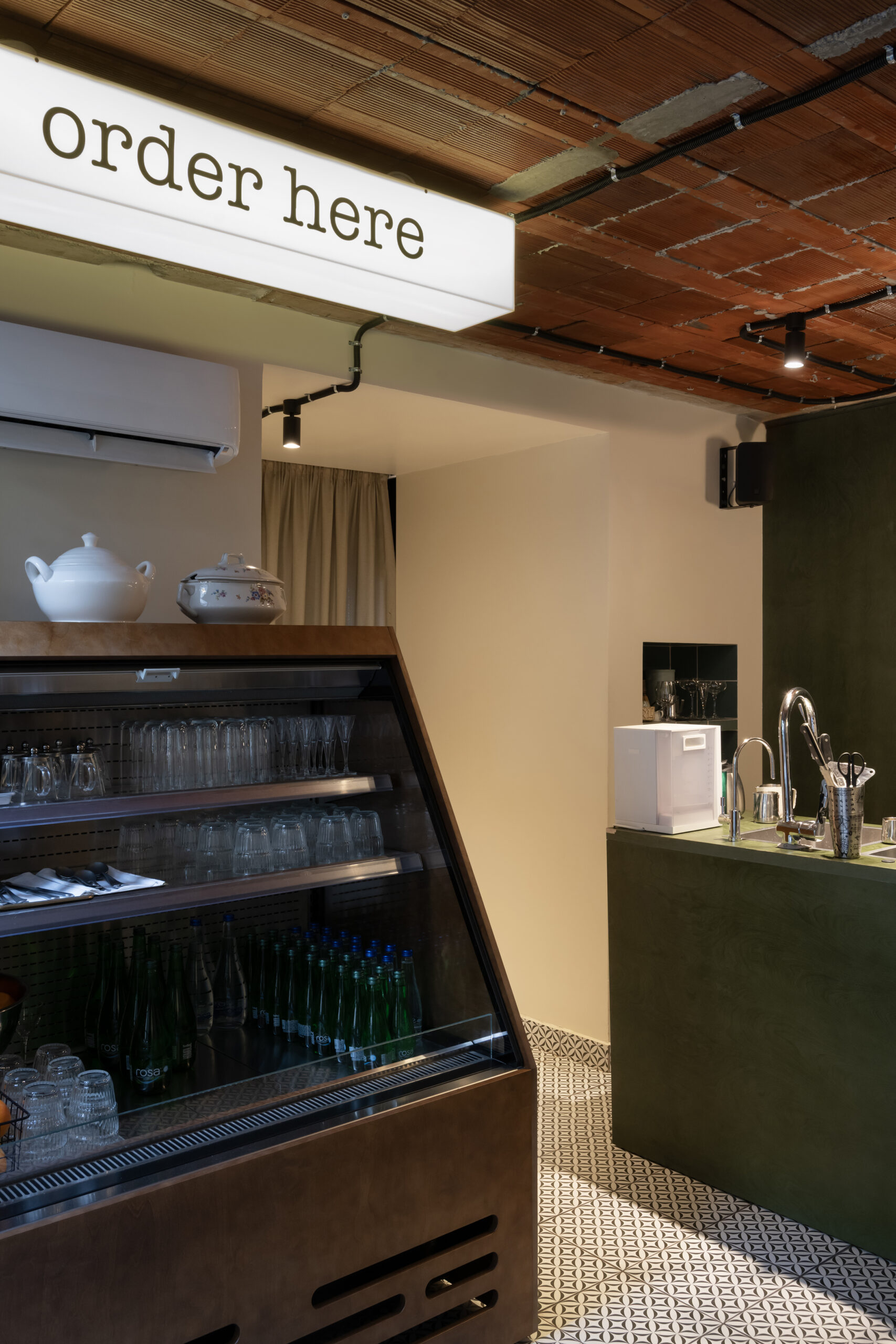Here, we worked with green plywood, expressive textures, and visible constructions — including an exposed brick ceiling, lightboxes, and curtains — creating a vibrant and approachable atmosphere without losing architectural integrity.