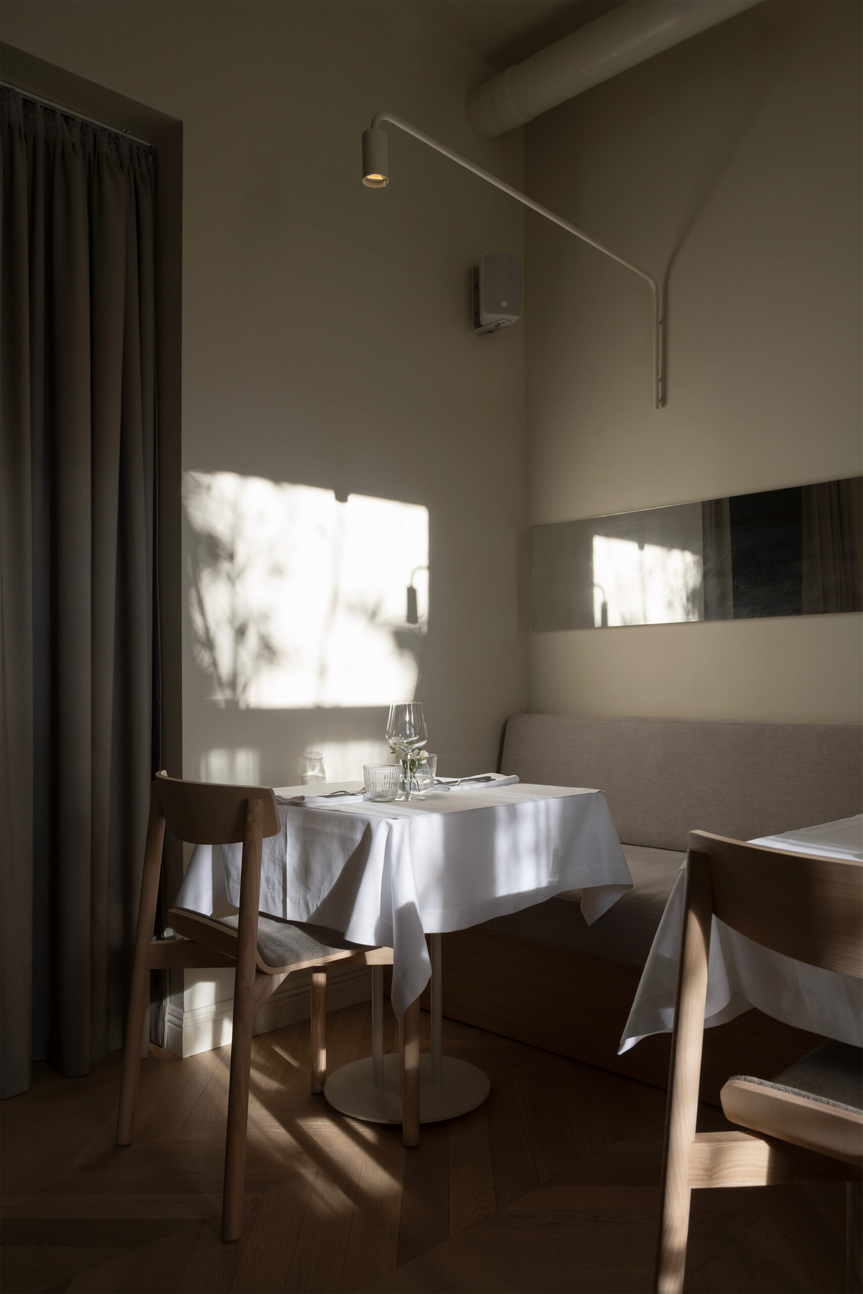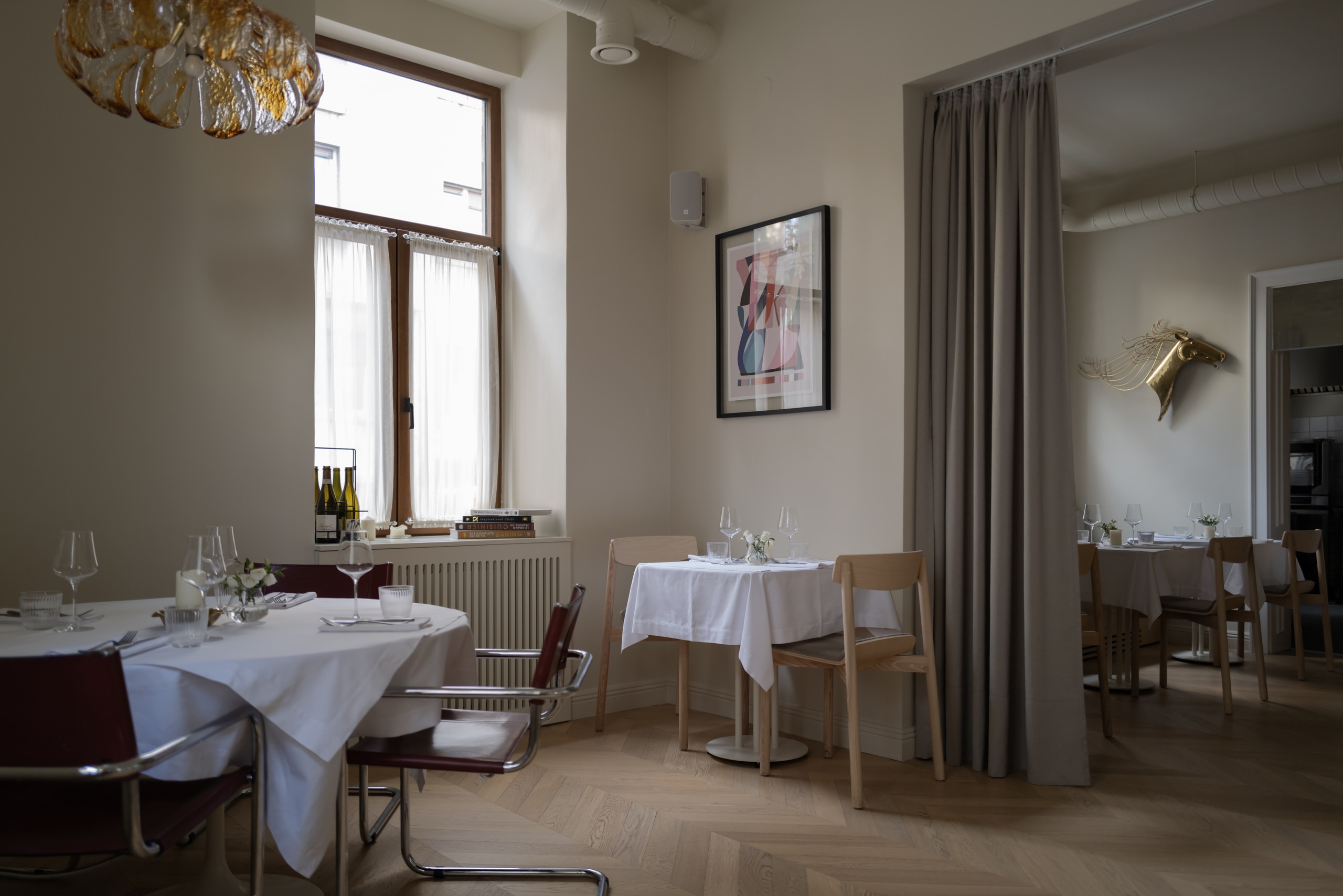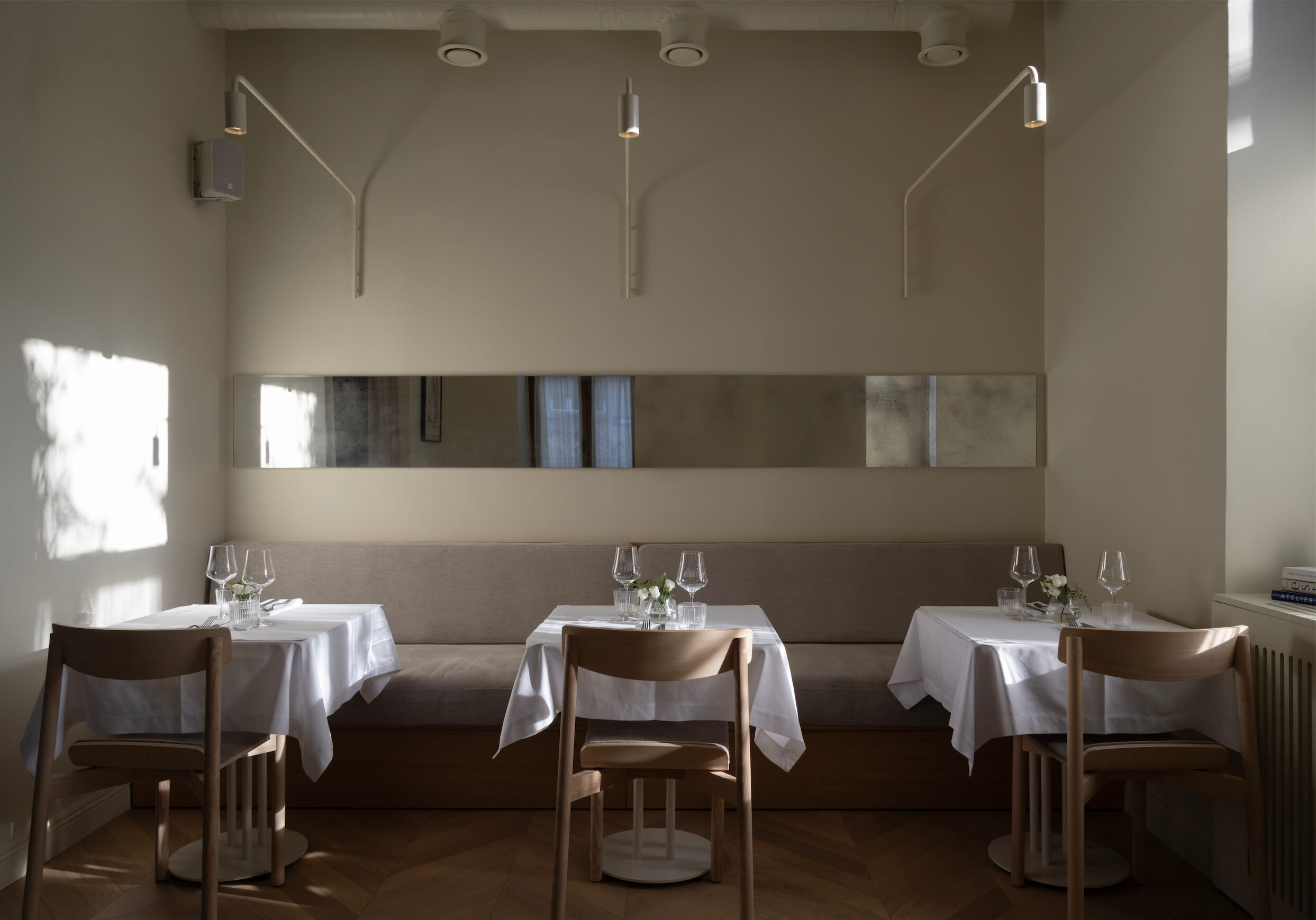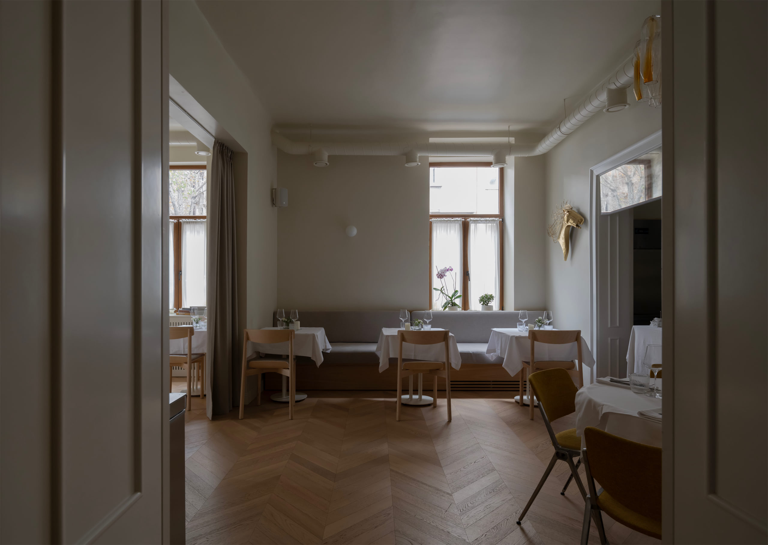 Fresca Restaurant is conceived as a fine dining experience, continuing the aesthetic lineage of the team’s previous project, Table 57. Selected vintage furniture pieces were brought into the new space, creating a sense of continuity, while the overall atmosphere was elevated to a more refined and sophisticated level.
