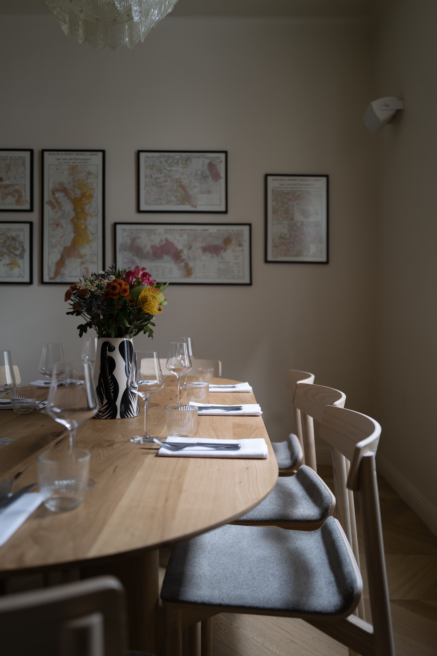 Lighting is intentionally restrained: only two vintage chandeliers descend from the ceiling, while all additional illumination is provided through discreet wall lighting in neutral tones, ensuring visual harmony and allowing the chandeliers to remain the focal point.