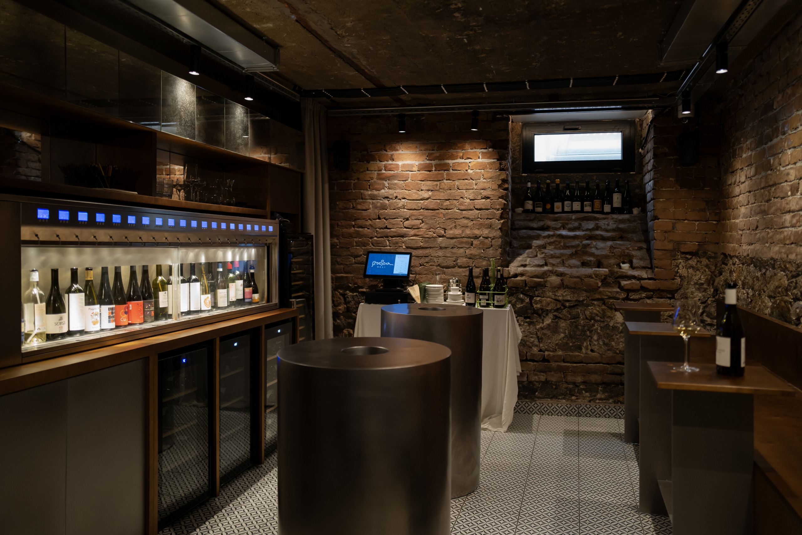 The space is organized around an Enomatic system, which becomes both a functional and visual centerpiece. Fresca Cellar operates as a wine bar where guests can explore a wide range of wines through tasting, emphasizing openness, discovery, and movement.